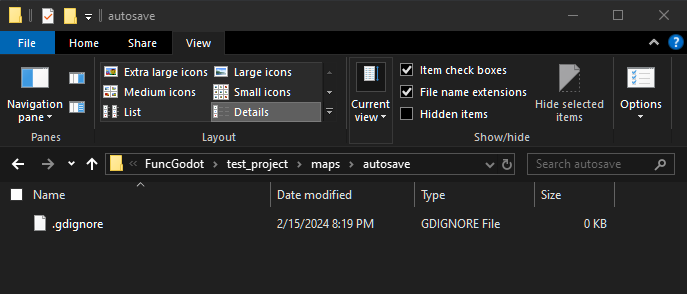 However, Godot has its own handy feature to combat this. Any directory with a .gdignore file will not be scanned and imported by Godot. To save yourself some headache later, open the autosave sub-directory in your operating system's file explorer. If using Windows, make sure you have File Name Extensions enabled under the View tab. Create a new text document in the sub-directory and rename it .gdignore, exactly like that with the .txt extension removed.