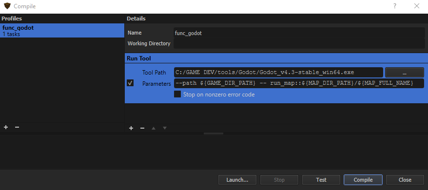 The TrenchBroom Reference Manual covers Compiling Maps quite thoroughly. If you chose to use the Godot Editor for your launch executable, make sure to start your parameters with the --path command. You'll then add the -- run_map:: build command we defined earlier, using the built-in TrenchBroom variables: ${MAP_BASE_NAME} to get the name of the currently opened map file, ${MAP_DIR_PATH} for the path to the currently opened map file, and ${GAME_DIR_PATH} for the path to the current game as defined in the game preferences.